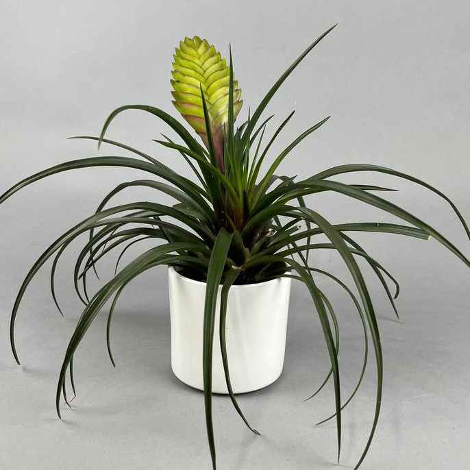 Ефемерна «повітряна» рослина без ґрунту — тримається на дереві, камені, склі. Прекрасний вибір для арт-просторів, флораріїв, мініатюр. У культурах Центральної Америки — символ свободи, духовної легкості й чистоти. Вимагає обприскування або замочування, яскравого розсіяного світла.