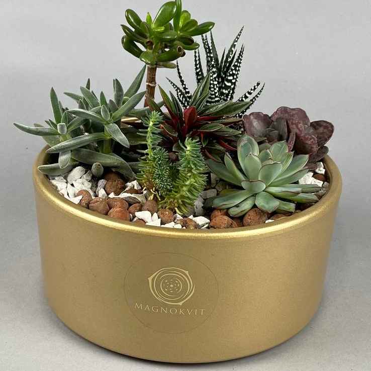 Ця композиція — маленький світ природи і гармонії. Кожен сукулент тримає свій настрій і характер. Вона наповнює простір спокоєм і натхненням. Ідеальна для будь-якого куточка дому.